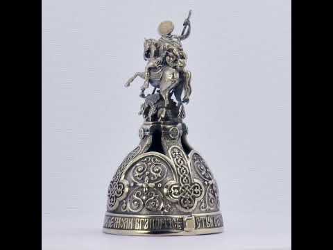 Сувенирный колокольчик «Георгий Победоносец» выполнен из бронзового сплава. Изделие также может быть выполнено из серебра или золота по желанию заказчика.